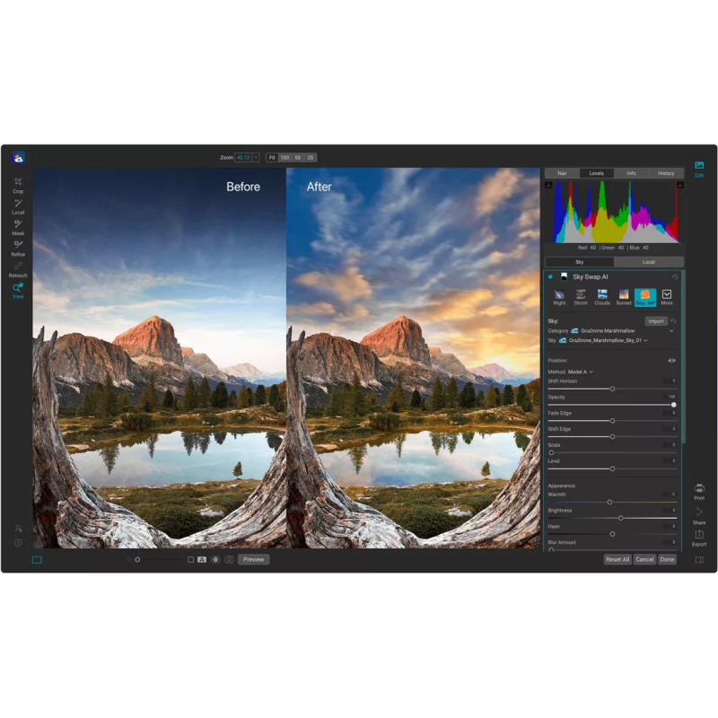 ON1 Sky Swap AI - це інноваційний інструмент від компанії ON1, який дозволяє легко і швидко змінювати небо на фотографіях. Цей продукт є дуже популярним серед фотографів, які хочуть додати особливої атмосфери своїм знімкам. ON1 Sky Swap AI має ряд переваг, які варто відзначити:- Розширений діапазон кольорів;