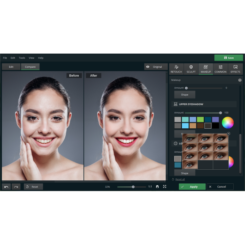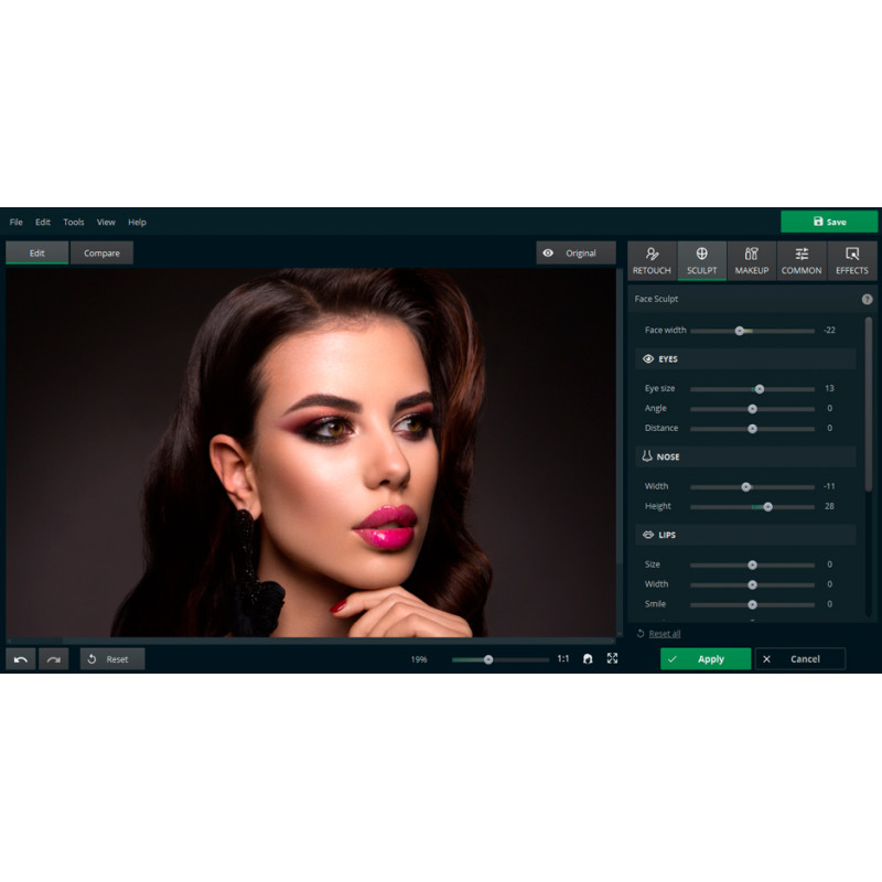 PhotoDiva дозволить позбутися зморшок, відблисків і почервоніння. Програма вирівняє тон шкіри, додасть засмагу та підкреслить вилиці. За кілька кліків ви зможете усунути ефект червоних очей і темні кола, змінити колір райдужної оболонки і зробити погляд на знімку більш виразним. Додатково можна попрацювати над посмішкою. Робіть губи тоншими або об'ємнішими, змінюйте їх колір на будь-який інший і відбілюйте зуби. Створити ідеальний портрет просто!
